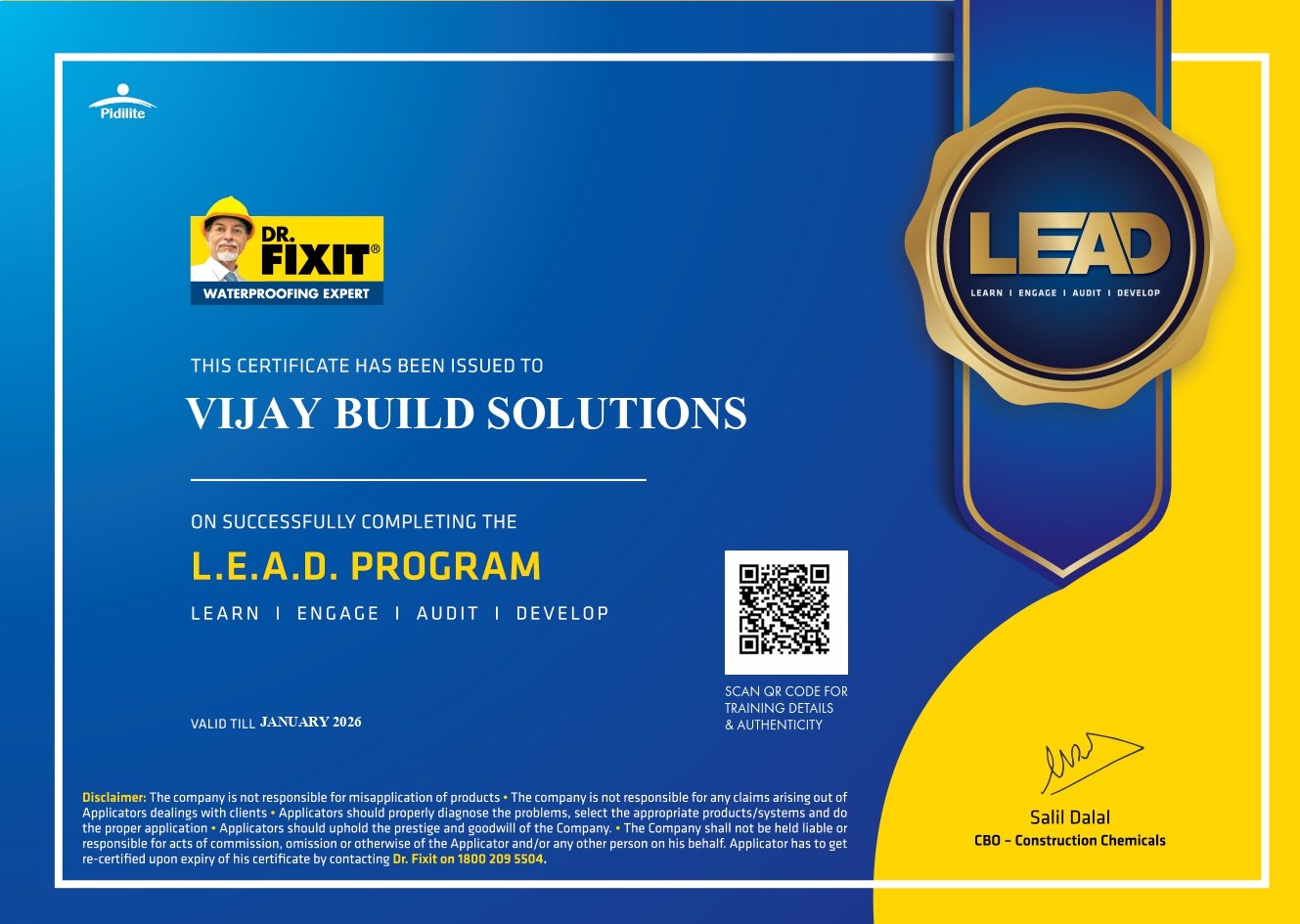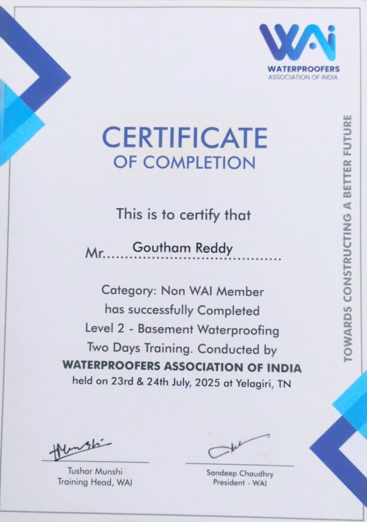 At Vijaya Build Solutions, we are dedicated to providing long-lasting and reliable waterproofing solutions that protect your structures from water damage, seepage, and deterioration. With a team of experienced professionals and advanced materials, we ensure that every project we handle stands the test of time — safe, strong, and leak-free.